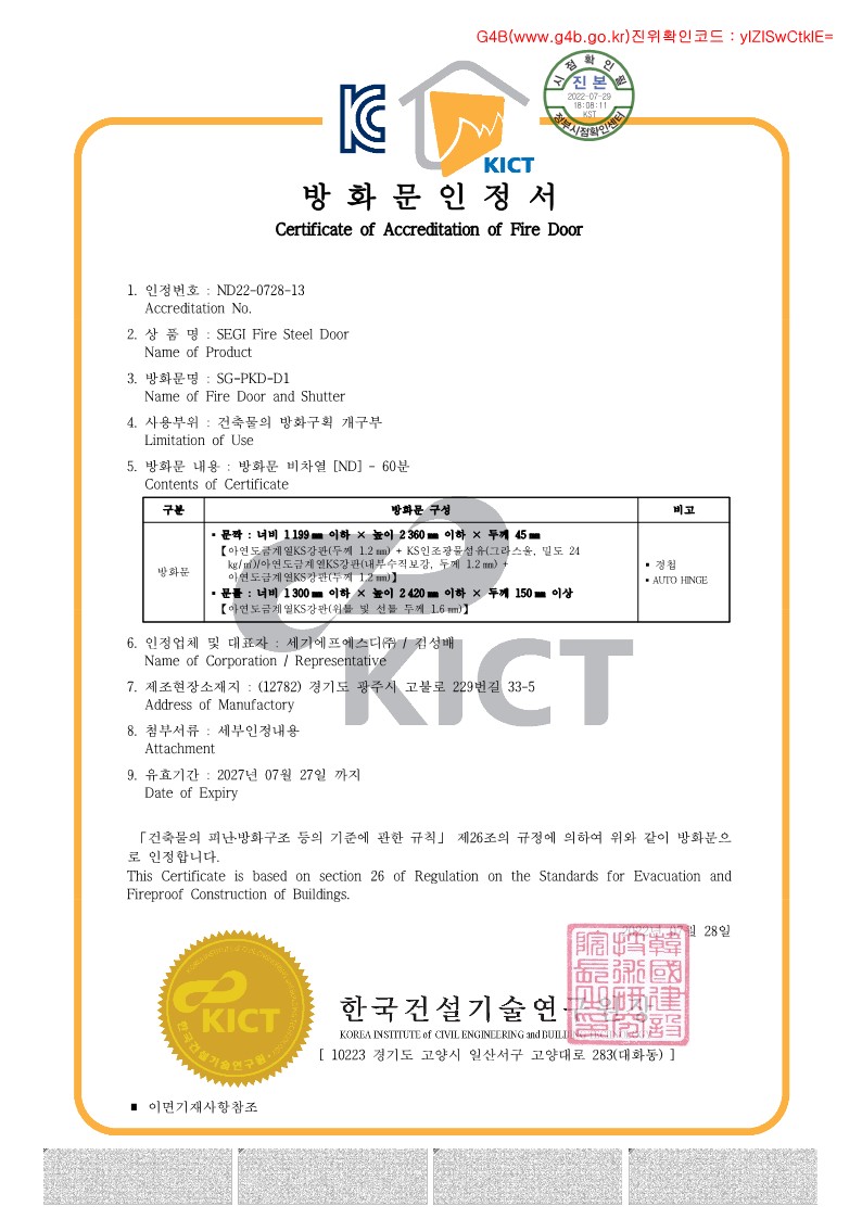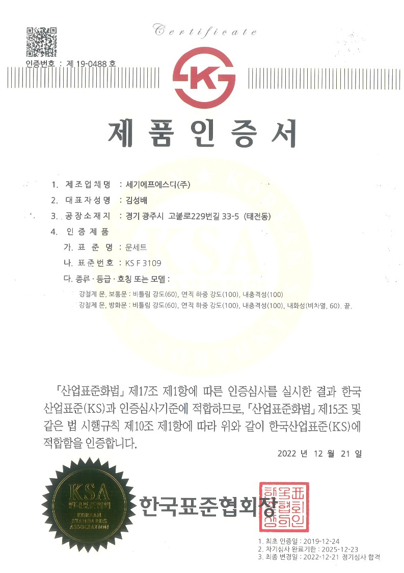 방화문 품질 인정 및 특허 , KS 인증서 보유