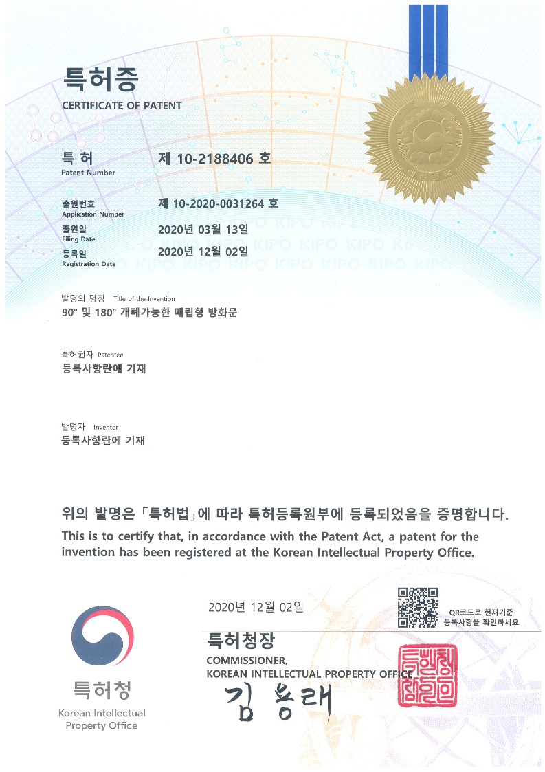 특허: 제 10-2188406호 (90º 및 180º 개폐가능한 매립형 방화문)